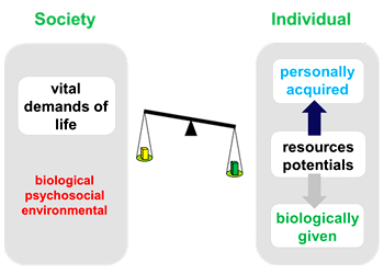In order to be healthy each human being has to fulfill all demands of life such as adequate nutrition, assurance of personal safety, hygiene, social integration and possibly procreation. For this purpose each human being has received abilities at birth and must also develop further abilities as life progresses. These abilities have to serve also in our future. Therefore they are called potentials. If the biologically given and the personally acquired potentials together suffice to cover all the vital demands of life a person is healthy. If they are insufficient she or he is diseased. Consequently, each individual has the responsibility to take good care of his or her biologically given potential and to continuously acquire new personally acquired.