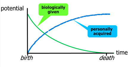 The biologically given potential is largest at the time of birth, decreases throughout life and reaches zero at the time of death. The personally acquired potential is quite small at the time of birth, but it can grow throughout life provided a person is working for it. For two reasons the personally acquired potential is particularly important. First, as we grow older we depend more and more on the personally acquired potential. Second, the personally acquired potential is able to compensate in part for deficiencies of the biological given potential. These facts reveal that support of the personally acquired potential can do a lot to preserve the people’s health. Teaching in schools and through mass media should achieve much more importance in health care. Our experiences have shown that awareness of the people about the Meikirch Model increases their self-responsibility for health and makes health services more effective.
